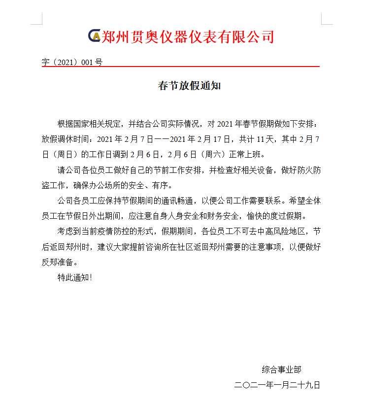 舊歲已展千重錦,新年再進百尺竿。成績都是奮斗出來的!希望在2021年貫奧的各位家人能夠同心協力、共創佳績。同時根據國家的相關規定對于2021年春節放假做出以下安排: